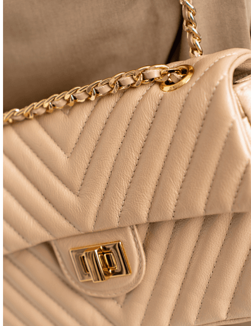Bolsa Kiara Média Chevron Couro Nude com Ferragens Douradas